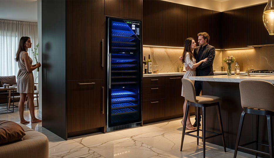 La vinera Lambrusco 160 de DRIJA está diseñada para verdaderos coleccionistas. Su capacidad de 160 botellas en 13 estantes de madera barnizada combina un diseño empotrable con sistema de enfriamiento triple que permite almacenar vinos tintos, blancos y espumosos con precisión. La iluminación LED azul, el panel táctil y su elegante puerta de acero con doble vidrio aportan estilo, eficiencia y funcionalidad para cualquier espacio gourmet o cocina moderna.